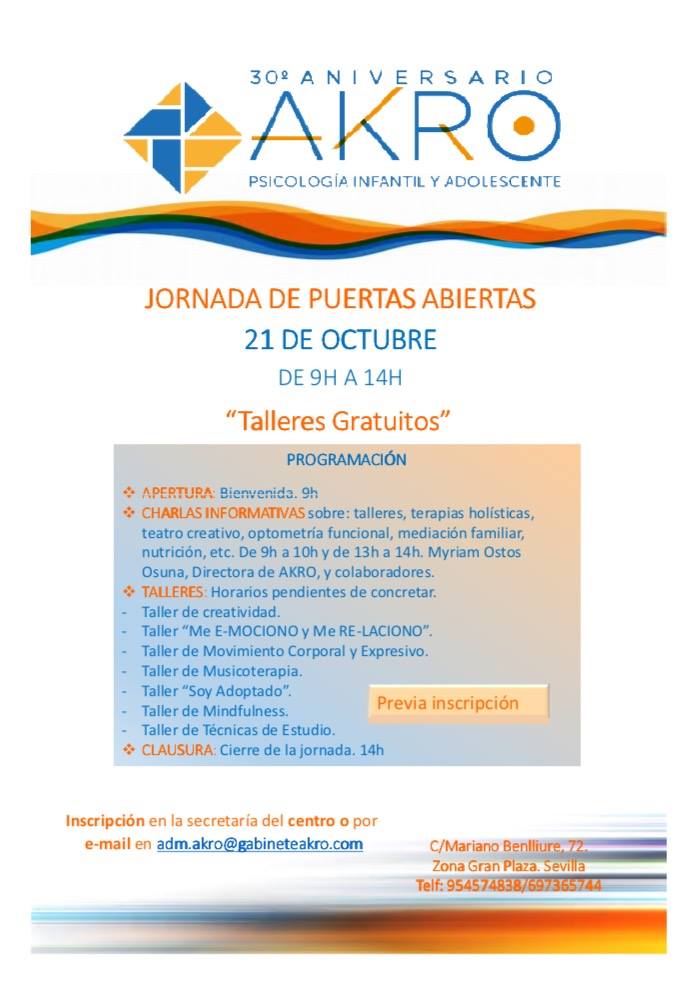 El día 21 de octubre realizamos en nuestro centro, AKRO Psicología Infantil y Adolescente las jornadas de puertas abiertas con motivo del 30 aniversario.